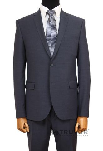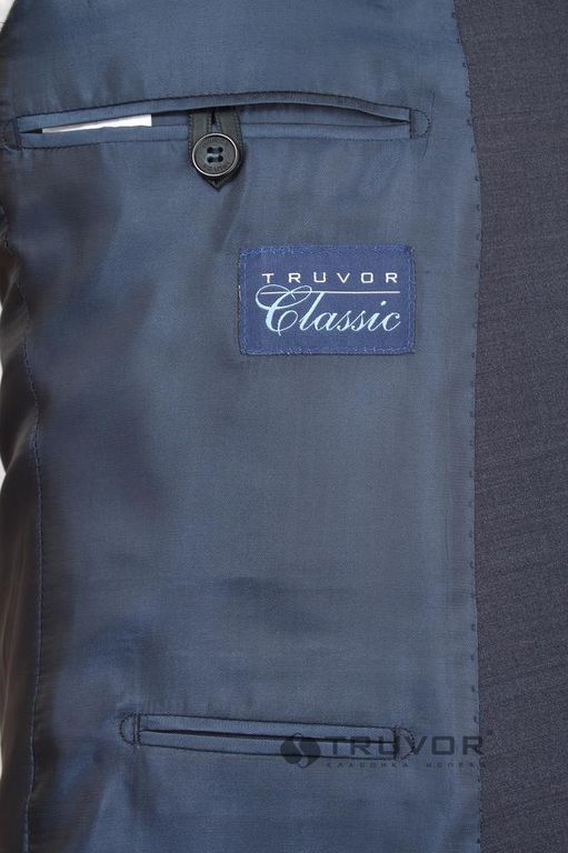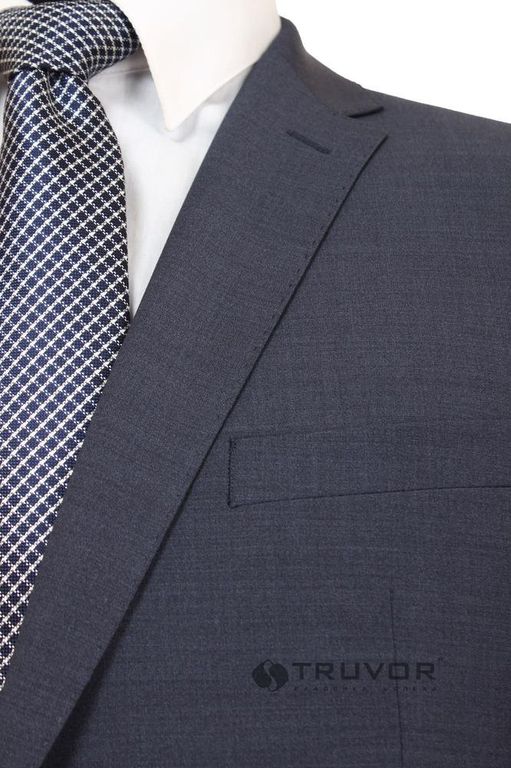Мужской классический костюм серо-синий полушерстяной в слепую клетку с декоративной вспушкой лацкана износостойкий с эластаном